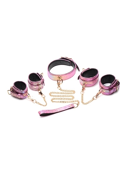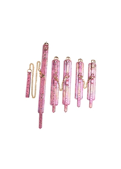Seduce your partner with this Captive Cobra bondage set! You don’t have to wear red and black to be kinky; enjoy this seductive, serpentine set with its pink color and iridescent rainbow shine that will bring out the blushing rose in any submissive! The set comes with two wrist cuffs, two ankle cuffs, a collar and a matching chain leash. Additionally, each of the cuffs connect with short, golden chains that match the chain leash and the golden, buckle closures. Adjust for comfort with the buckles and straps. All metal is nickel-free and the vegan friendly, faux leather is made of polyurethane (PU leather). Spot clean with a soft, damp cloth.