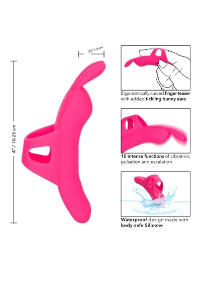 The Neon® Vibes The Flirty Vibe puts knee-shaking pleasure at your very fingertips! The ergonomically curved finger vibrator is sure to thrill with pinpoint stimulation and full-coverage vibrations. The playful finger vibe indulges your every fantasy with 10 functions of vibration and tickling bunny ear teasers. The contoured finger shape and ultra-plush silicone are made to explore sensual sweet spots and pinpoint intimate desires with ease. The flickering ears and contoured body let you deliver thrilling vibrations from any angle you desire. The stretchy and comfortable finger loop allows any user to play with ease. Find your favorite setting with the touch of a button while you cycle through 10 powerful functions of vibration, pulsation and escalation. The easy-touch control button lets you enjoy frustration-free control. Get playful with up to 60 minutes of stimulation with every charge. Charge up your passion in only 1 hour by plugging the provided USB cable into the self-sealing charging port on the base of the massager. The slim massager's discreet size makes it the perfect travel companion, letting you embrace radiating pleasure wherever your fantasies take you.