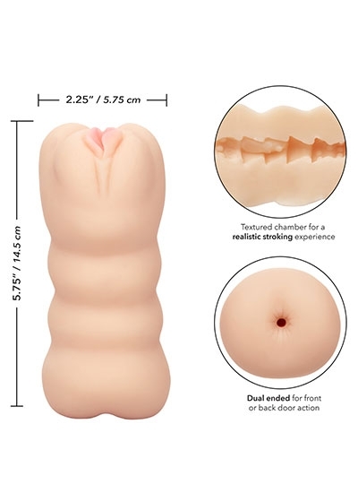 Give yourself over to the fantasy of a lifetime with the Cheap Thrills® The Three Way masturbation stroker. Get the best of both worlds with the thrilling dual end design for front of back door play. A uniquely textured chamber and ultra soft, stretchy Pure Skin® material wrap your tool with life-like sensation. Whether indulging at home or wherever pleasure takes you, the compact 5.75" (14.5 cm) is the teasing travel companion you're craving. The premium Pure Skin® is unscented, phthalate free and maintenance free for truly explosive results.