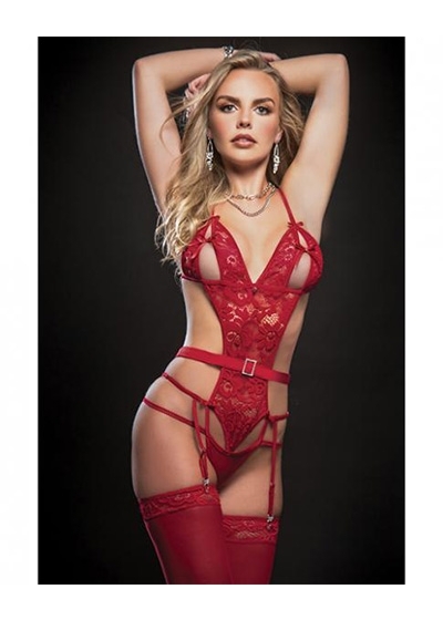 Daringly sexy, this teddy comes with alluring keyhole cutouts in the cups and delicate lace pair up with curve hugging strappy details. Includes stockings.
