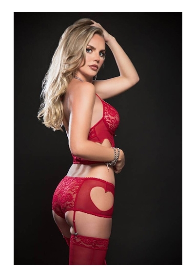 Make any moment deservedly sexy with a lace boyshort mix with sheer mesh featuring heart shape cut-out on the sides and open front cuts hiding under daisy bud charms. Matching wired cup halter top with plunge front, daisy buds and decorative trim. Includes stockings.