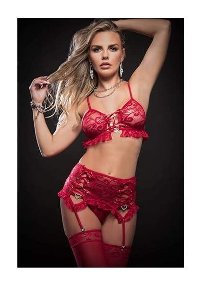Queen of hearts this decadent garter skirt in exquisite lace played up with a keyhole cutout in the front with lace up detail and matching bra. Rhinestone hearts gets flirty with ruffle trim. Includes stockings and thong.