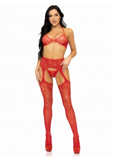 3 PC Rhinestone Bra Top, G-String, and Fishnet Garter Belt Stockings