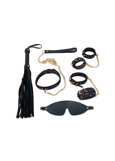 High-quality 6-piece bondage set by Bad Kitty in a stylish leather look and a classy colour scheme: dark blue with gold-coloured metal details. The set consists of 1x eye mask, 1x neck cuff, 1x leash, 1x mini whip, 1x handcuff and 1x ankle cuff.