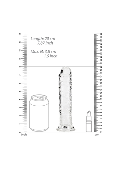 Ready for a CRYSTAL CLEAR orgasm? Reach your finest climax in style with these beautifully shaped, clear dildos. This dildo can see right through you and will know exactly how you like it. This dildo is suitable for anal and vaginal use! Finger-like precision stimulation, great for yummy anal stimulation, and definitely a clitoris friend? You’ll find all that and more in this dildo! The base functions as a suction cup for hands-free use, but also gives it the ability to be used in a harness. All REALROCK CRYSTAL CLEAR dildos are phthalate-free, latex-free, body-safe and non-porous which makes them easy-to-clean and gives them a longer lasting durability.This model stands 8.7” (22 cm) tall including the suction cup, has an insertable length of 7.9” (20 cm) and has a girth of 1.57” (4 cm).