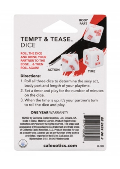 Fun, pleasurable and on the edge of pure ecstasy, the sensational Tempt & Tease™ Dice is an extra-naughty game made for pure pleasure. This naughty game for couples is a playfully dirty dice game made for spontaneous pleasure. Introduce this dirty game to your bedroom behavior to ignite a new spark with fresh playtime ideas. To play, simply roll the dice to determine body part, activity activity and length of playtime for a sexy good time. There are no losers in this game, each round of this seductive game works to tease, please and always end with each player in a state of pure bliss. Each set includes 3 acrylic dice.