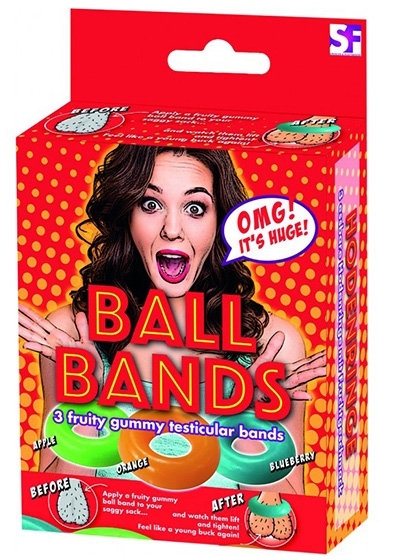 Ball Bands - 3 Edible Fruity Gummy Testicular Bands. Flavors include Apple, Orange and Blueberry.
