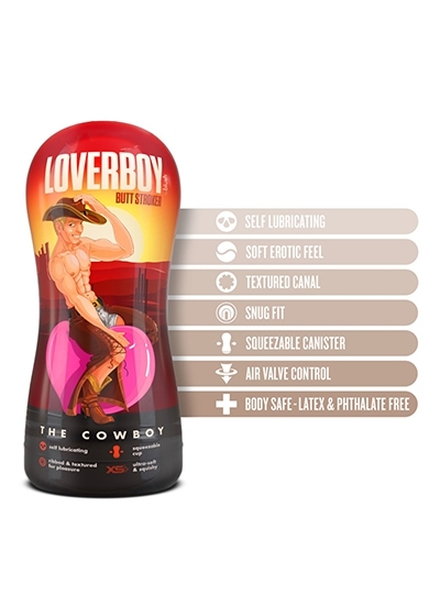 Cowboy is loaded with fun! This pocket stroker is self lubricating, just add a little water or saliva and everything gets slippery. Squeeze the cup and open or close the PerfectFlo Air Valve Control for more suction and pleasure. The Loverboy masturbators are soft, flexible, and filled with sensational textures that will drive you over the edge! The Cowboy contains no Phthalates, Paraffins, or Latex and is so realistic… It feels like the real thing. It's time to ride the waves of pleasure! Self-lubricating properties are temporary. It will last up to 12 uses. To clean, wash with soap and water. Pat dry and allow to air dry before storing. Use products only with water based lubricants. It is recommended to start using water-based lubricants after self-lubricating properties begin to diminish. The Loverboy is a sex toy for men.
