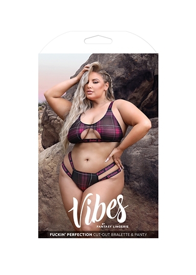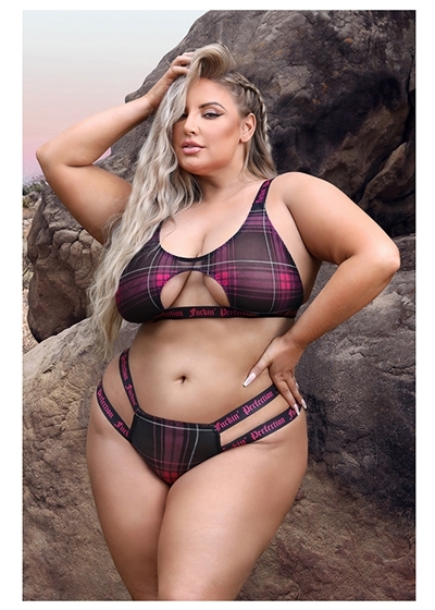 Cut-out Plaid Mesh Bralette & Matching Caged Panty with "Fuckin' Perfection" Elastic
