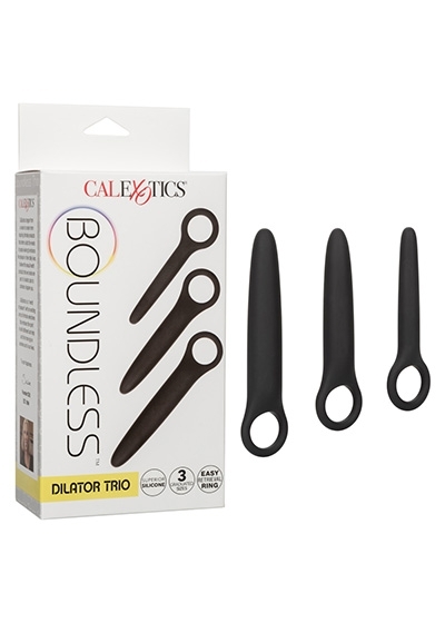 Expand your horizons of pleasure with the Boundless Dilator Trio. The seamless dilator set includes 3 graduated silicone dilators with easy finger loop and multi-use design. The sensually tapered probe and graduated size allow for gentle dilation. The premium silicone probes have a durable finger loop for gentle insertion and stimulation. The convenient loop can be paired with a mini bullet for intensified sensation! (bullet not included) The hypoallergenic premium silicone is body safe, unscented and phthalate free to keep you most sensitive spots, happy and healthy.