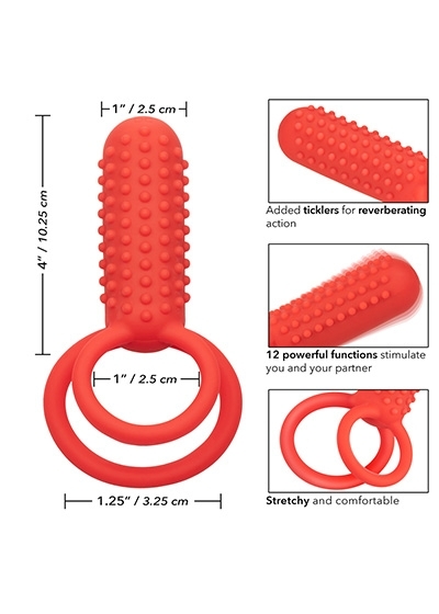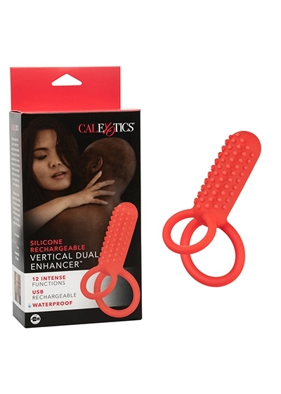 The CalExotics Silicone Rechargeable Vertical Dual Enhancer mixes 12 intense functions of vibration, a vertical teaser, and dual support rings for powerful knee-shaking pleasure. This dual stimulator ring is great for beginners looking to spice things up or erotic experts looking to add intense pleasure to their arsenal.