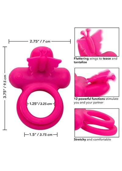 The plush body-safe silicone ring works to improve stamina and girth to make your lover moan for more, more, more. The tight dual ring maximizes sensitivity and elevates sensation throughout letting you enjoy longer, more powerful pleasure. Reach next level pleasure with 12 functions of vibration and a flicking butterfly teaser made to leave both partners in a state of orgasmic bliss.