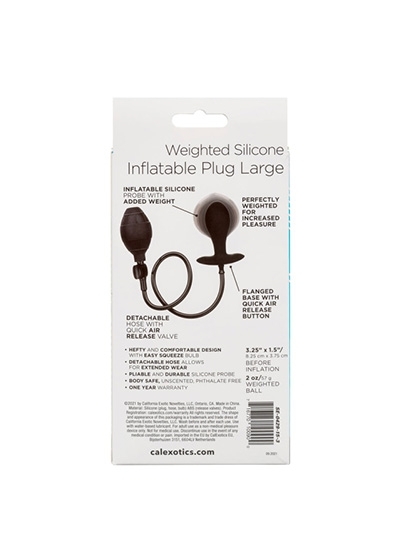 The CalExotics Large Weighted Silicone Inflatable Plug is a one-of-a-kind anal probe with inflatable weighted body, easy squeeze bulb and detachable hose. For increased pleasure, this plump probe is perfectly weighted with a 2 oz ball.