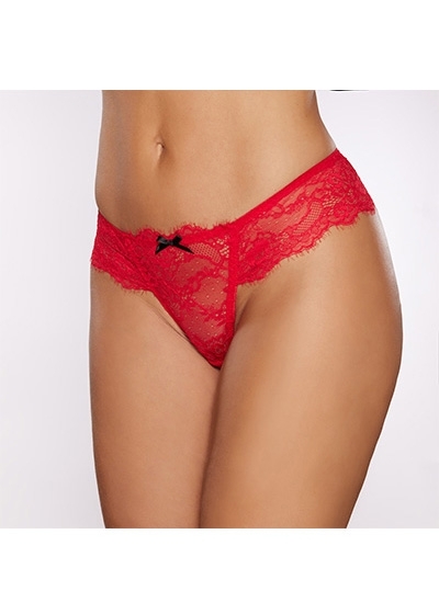 The quintessential babe panty, you always need to have. Wide lace band thong with eyelash lace accents. Red mini bow on front with added red lace-up on the back.