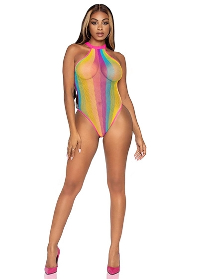 Live life in vivid color with this neon Bodysuit by Leg Avenue, featuring a Rainbow Striped lingerie teddy with solid neon trim, racer top, and full back. The perfect rave or festival outfit right out of the box or pair it with leg wraps and adhesive body jewels, sold separately.