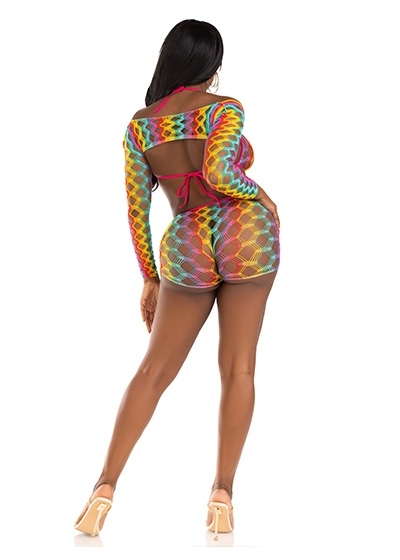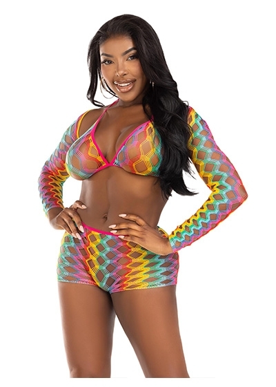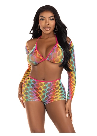 Show off your true colors in the vibrant 3 piece rainbow lingerie set by Leg Avenue. Featuring a stunning array of colors, this hot lingerie look features a wide net bra top with convertible halter straps, long-sleeved shrug, and curve- hugging boy shorts. Turn heads in and out of the bedroom, this daring look is perfect for pride, rave clothing, and festival outfits.