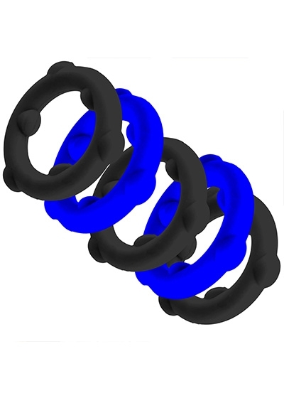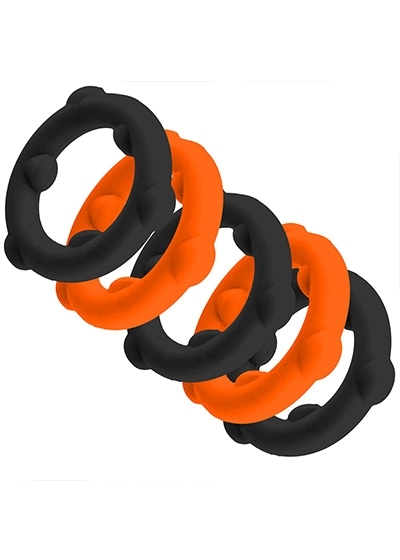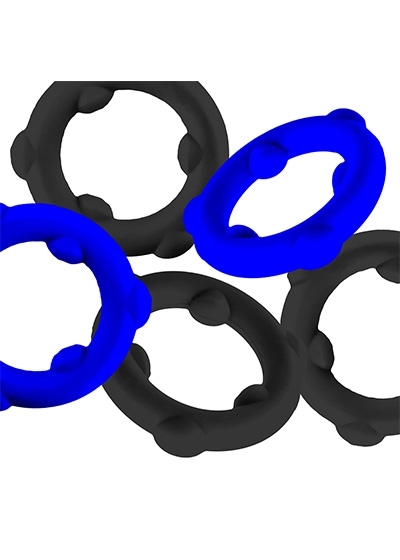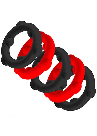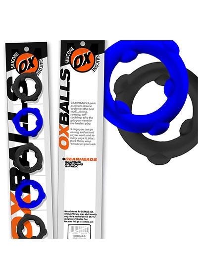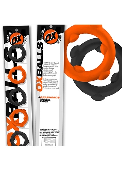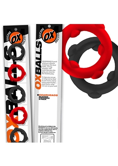 GEARHEADS 5-pack liquid silicone mega-stretch cockrings are made for long hard play — Made stretchy but strong — will not crack, lose color, stain, or stretch out... Use any lube...