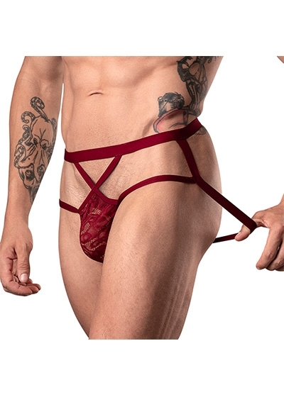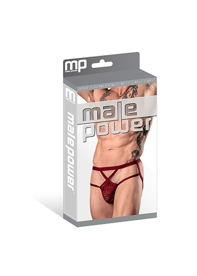 From the Lucifer collection by Male Power, the Strappy Jock consists of a full lace pouch secured by plush elastic strapping, criss crossed in front and butt boosting in back.