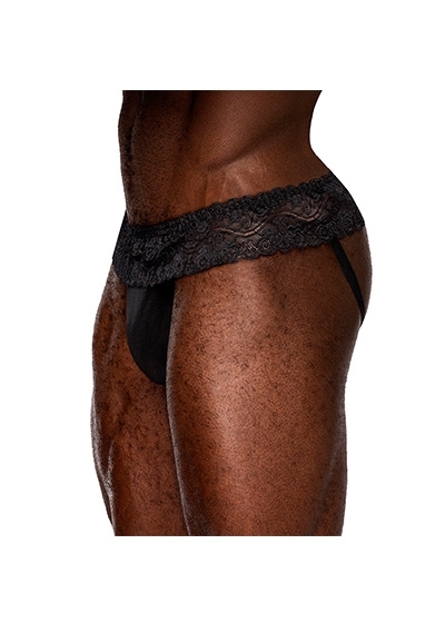 From the Sassy Lace collection by Male Power, the Skirt Jock features a lace ruffled skirted waistband with a sheer stretch mesh pouch and delicate stretch plush elastic legbands.