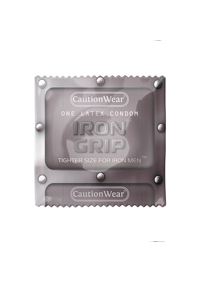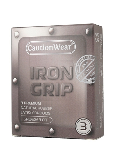 CautionWear® Iron Grip™ condom is a premium snugger fit latex condom, N-9 FREE, parallel-sided, transparent in color (clear latex), with reservoir tip, lubricated with ultra-smooth silicon-based lubricant. 100% electronically tested.