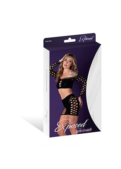 From the Seamless collection by Magic Silk, this style includes: a soft and breathable crop top with diamond fishnet long sleeves and a high waist short, adorned with clear rhinestones, two shaped rhinestones at center front, and cutouts. This stretchy style can conform to any body type and is extremely flattering!