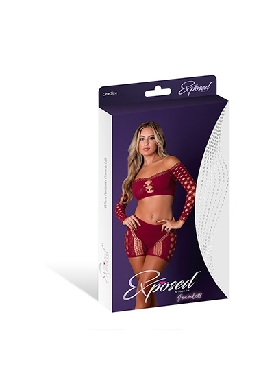 From the Seamless collection by Magic Silk, this style includes: a soft and breathable crop top with diamond fishnet long sleeves and a high waist short, adorned with two shaped rhinestones at center front, and cutouts. This stretchy style can conform to any body type and is extremely flattering!