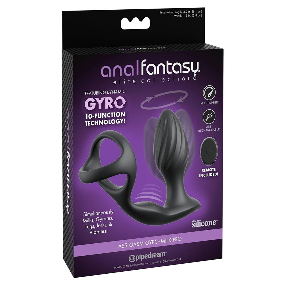 Experience the ultimate ass-gasm with the incredible Anal Fantasy Elite Collection Ass-Gasm Gyro-Milk Pro! This unique prostate pleaser offers true innovation with a fully automated milking system, to simultaneously stroke your prostate and rock your perineum. The Ass-Gasm Gyro-Milk Pro’s textured gyrating plug offers 10 functions of gyration and vibrations, allowing the base to rock back and forth to apply pressure against the perineum. The "Gyro-Milk” action rhythmically jerks the c-ring and your cock, delivering rock-hard erections and the most explosive ejaculations every time. Use the included remote to add an exciting dimension to solo and partner play! Your experience is further heightened with 3 powerful motors, including vibrating bullets in the plug and perineum stimulator. The ergonomic design with a built-in c-ring, gently tugs your package and allows for optional wear for solo sessions or partner play!