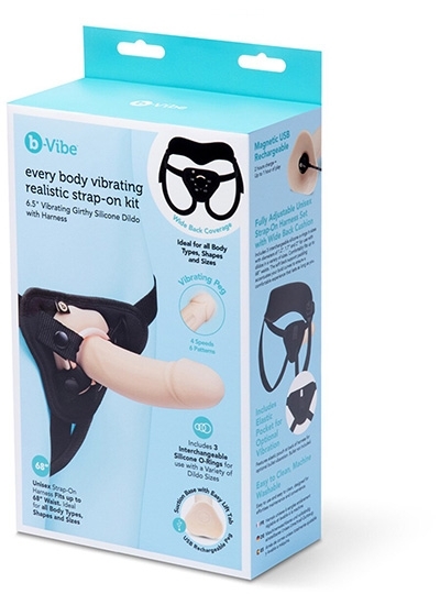 Designed specifically for those new to strap-on play, our Every Body Vibrating Realistic Strap-On Kit features a 6.5” Vibrating Girthy Silicone Dildo that invites exploration and excitement. With its gentle curve, this toy is perfect for stimulating G-Spots and prostates,