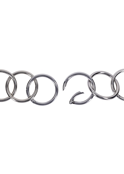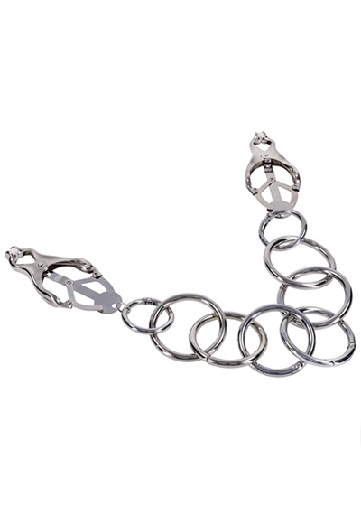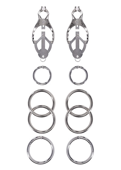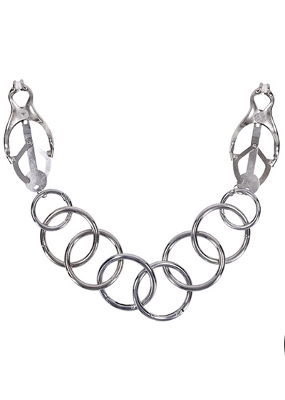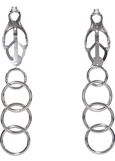 This set features a four-ring system, including two center connected O Rings and two outer connection rings for customizable play. Connect the rings together, attach to rope, or increase weights for enhanced bondage play. Finished in polished silver metal with textured silicone-tipped clamps for a secure, unforgiving grip, this set rewards endurance and commands submission with every movement.