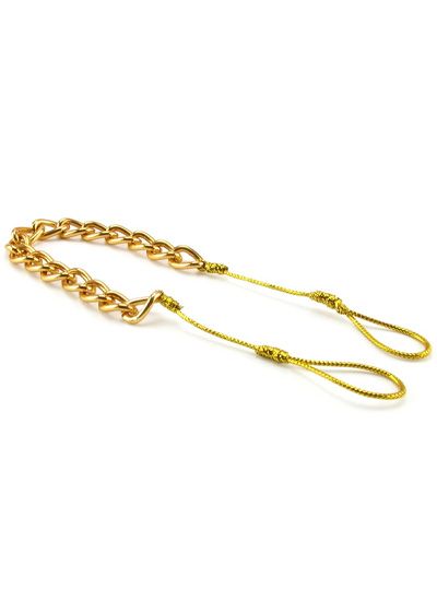 From the Cleopatra Collection of exciting body jewelry comes a naughty but nice nipple chain set in shiny gold. This non-piercing treat attaches to the nipples with adjustable metallic string loops that can be loose or tight, depending on what you're in the mood for. Once the loops are attached, gold chain links swing and dangle to draw attention to your assets. The body friendly ABS material is safe for long-term wear.