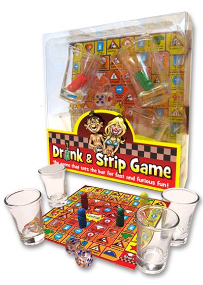 Drink and Strip the game that sets the bar for fast and furious. Board game, 4 shot glasses, 4 different colored pieces, 2 dice. 2 to 4 adult players, drinking game. Drink and Strip Game from Ozze Creations.