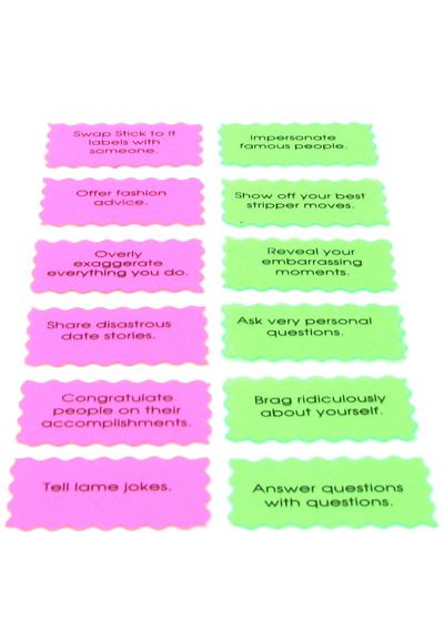 Add one to the front of each party-goers glass at the beginning of the night, guests will socialize normally, while every few minutes (either as specified by you, or a timer) acting out the dare. Examples include 'Impersonate a famous person', 'Answer questions with questions' and 'Tell lame jokes'. There's a single 'Switch labels' tag, which needs to be traded with another player, the game continues until the 'Switch labels' card has been used three times on one player.