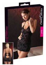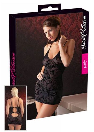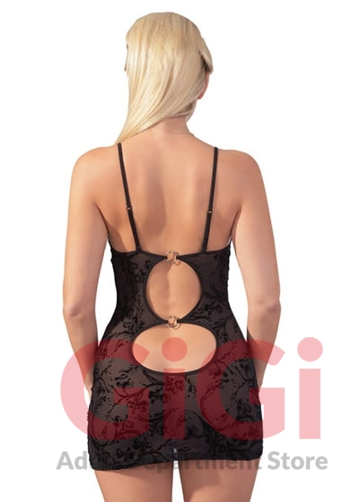 Black mini dress with narrow, adjustable straps, low-cut on the bottom, adorned with 2 rings.