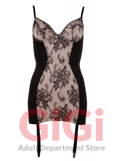 Cream-coloured suspender mini dress covered with black lace, with transparent inserts at the side and back. With underwired cups. All straps adjustable.