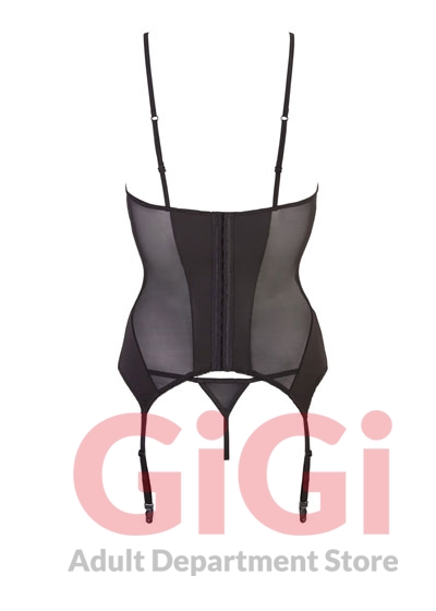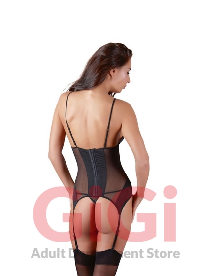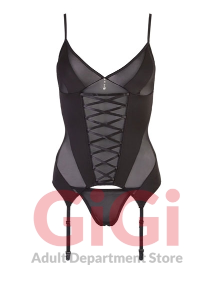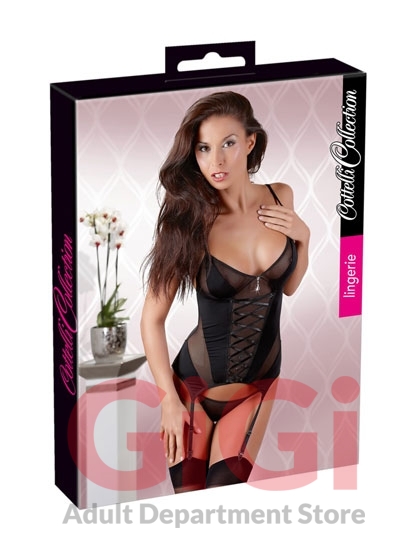 Basque and string thong made of transparent black power net fabric. The basque features slightly transparent inserts, a frontal decorative lacing and rhinestone details. Hooks in the back. Adjustable straps. Basque: 80% polyamide, 10% polyester, 10% elastane. String thong: 90% polyamide, 10% elastane. Without stockings.