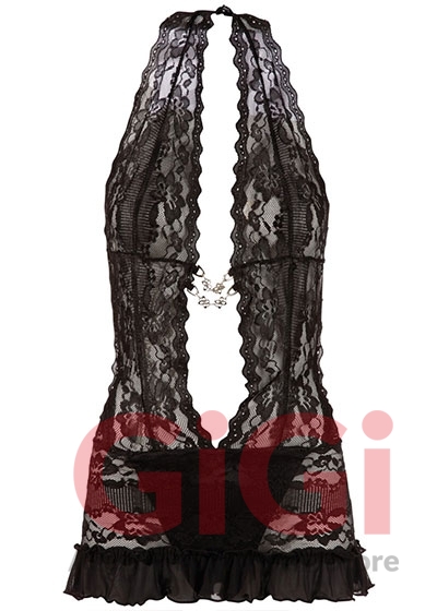 Delicate dress made out of floral lace. With a halterneck and very low-cut neckline that is only held together by 2 decorative chains. The dress is completely backless. Includes a sewn-on crotchless string. Lace subject to change.