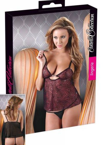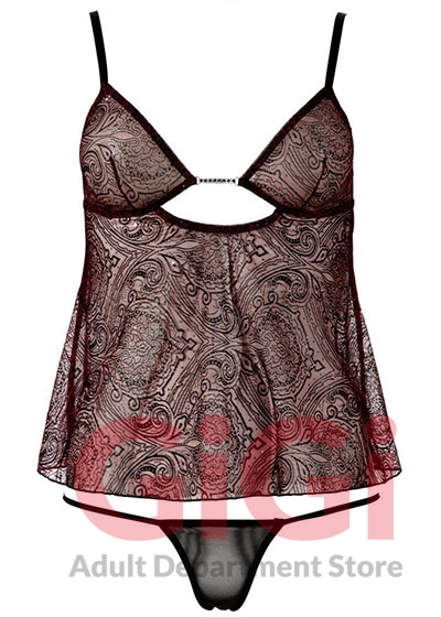 This cute babydoll will make you look sweet and sexy at the same time. It is made of burgundy red mesh fabric with a subtle black print and glitter details. The entire back is made of black mesh. Equipped with adjustable straps and a deep neckline trimmed with small rhinestones.