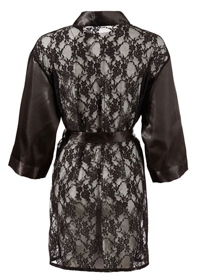 Short kimono with sleeves, a small ribbon at the front to tie the kimono together, and a removable belt around the waist. Made out of velvety soft satin. The back of the kimono is made entirely out of semi transparent floral lace.