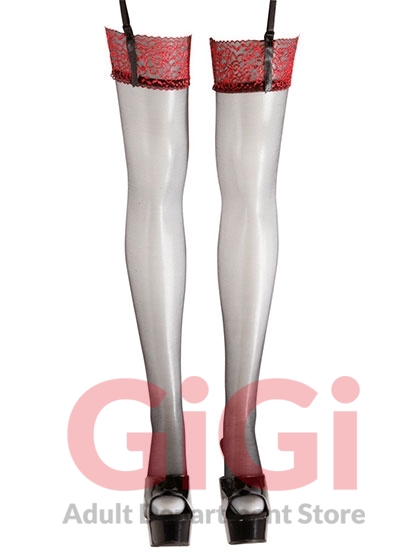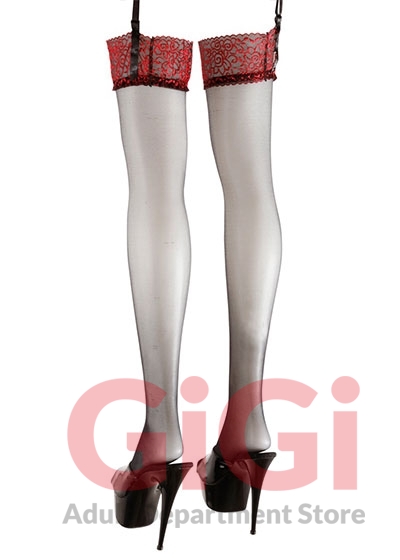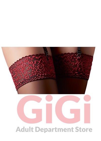 Black stockings with dark red lace top parts. 17 denier. Oeko-Tex certified. 90% polyamide, 10% spandex.