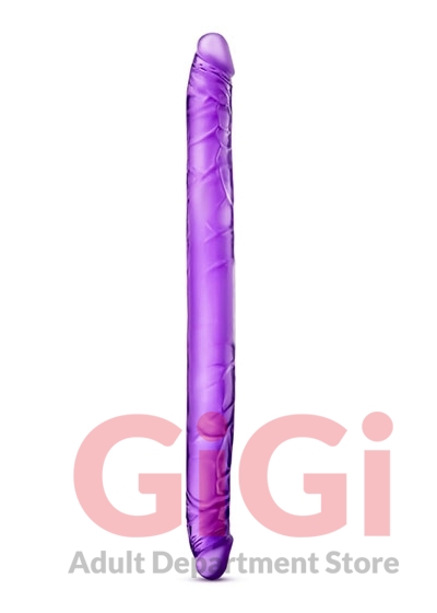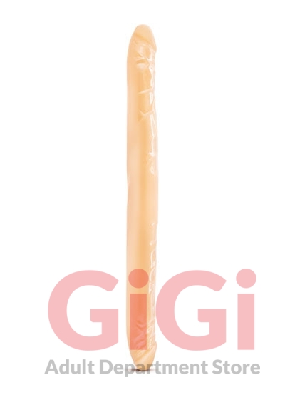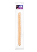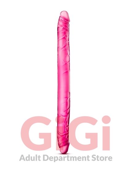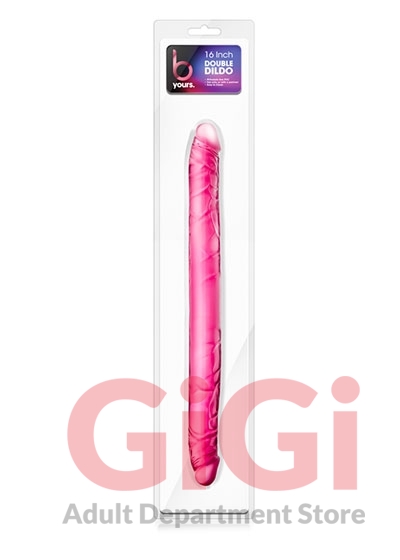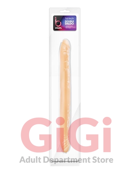 Blush Novelties B Yours 16 inches Double Dildo. Fun for all. Perfect for couples that both enjoy penetration or use it solo for double penetration! Feel. Realistic feel with just the right amount of firmness for a better than real experience. Perfect size. With 16 inches total length and 1.5 inches of width, this dildo is the perfect size. Clean. Non porous and easy to clean with soap and water or toy cleaner. Peace of mind. Made from body safe materials and meets or exceeds CE and ROHS international safety standards. Phthalate free, fragrance free and latex free. 16 inches by 1.5 inches, insertable 8 inches.