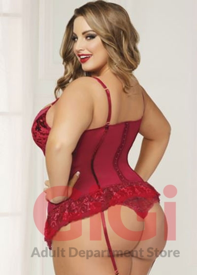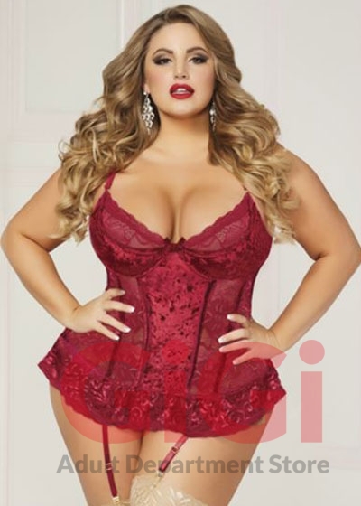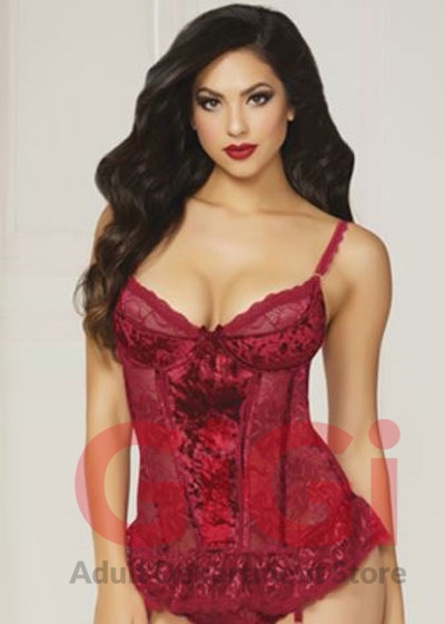 Two piece bustier set. Crushed velvet and lace bustier with underwire, lightly padded cups, adjustable straps, gold hardware, boning, hook and eye back closure, removable garters, and panty.
