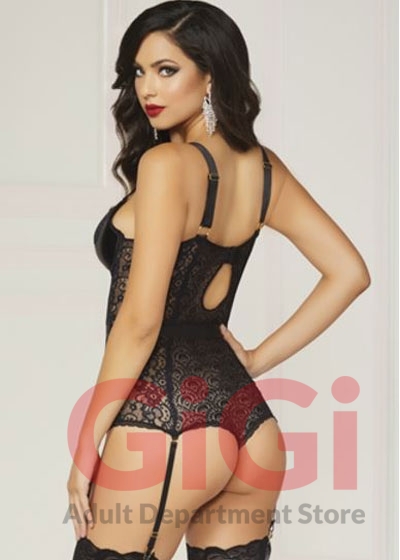 Two piece teddy set. Floral galloon and geo lace teddy with lightly padded stretch satin cups, satin covered underwire, U-shaped charm with rhinestones, extra wide satin elastic straps, gold hardware, hook and eye closure, lace trim, picot elastic, removable garters, snap crotch, and removable satin sash.