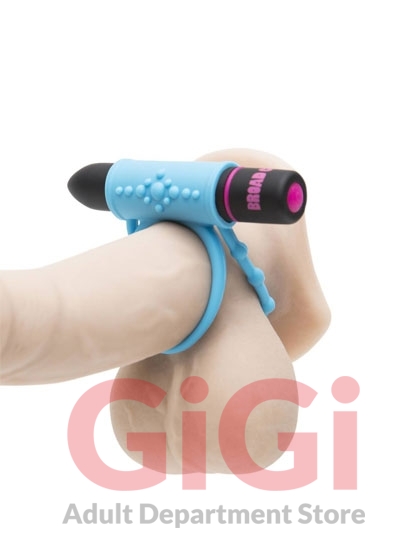 In fresh blue, the Love Ring slips over the base of the shaft and under the balls for an always-stable fit and sexy hard-on enhancing constriction. A full sized bullet slides through a slot about the rings- once switched on, 7 vibe patterns and 3 speeds pulse through the entire Ring. Position it upward to target clitoris, and other partner-placed sweet spots, or downward to pinpoint the wearer's perineum and scrotum. Pop the vibe out anytime to direct it absolutely anywhere else.