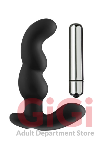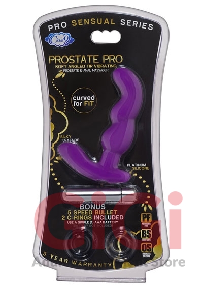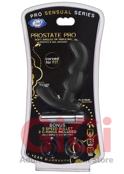 Prostate Pro Soft Angled Tip Anal Massager Black with C Rings. The precisely sculpted design of this sleek, vibrating anal massager will create the perfect prostate gasm every time. The prostate is sometimes referred to as the male G-spot and with the right stimulation can produce stronger and more powerful orgasms than solely penile stimulation. This vibrating massager features the ease of one touch vibration. Once inserted simply turn on the vibrator to receive waves of intense vibrating pleasure. The flared rocker base assists during insertion, and is ergonomically designed to bend with your body. Features: dual stimulation. Bulbous head to gently massage the prostate. Phthalate-free. Latex free. Premium Silicone. Flexible shaft with rocker base and dual stimulation points. 5 function removable bullet. Battery not included. How to use: prepare by applying a water based personal lubricant to anus and prostate massager then insert. Contract and release anal muscles slowly and the stimulator will massage the prostate. The stimulator may be used during solo or partner play. As you prepare to stimulate the male G-spot, technique varies greatly. Some like gentle thrusting movements while others prefer intense, constant pressure on the prostate itself. Non porous and easy to clean before and after use with Cloud 9 Toy Cleaner or hot, soapy water. Remove bullet vibrator before cleaning. Bullet is not waterproof. Compatible with water based lubricant, store in a dry, covered place.
