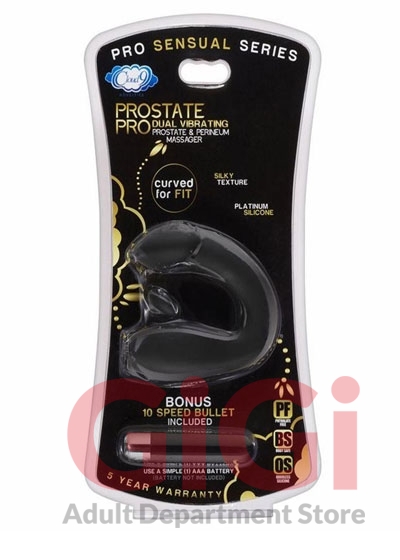 Prostate Pro Premium Massager Black hands free stimulation. Just insert, turn it on and enjoy. The dual stimulation of the prostate and the perineum taint will bring him to orgasmic bliss with every use. This is truly the ultimate design for maximum p-spot pleasure. The prostate is sometimes referred to as the male G-spot and with the right stimulation can produce stronger and more powerful orgasms than solely penile stimulation. The 10 vibrating functions with a built in massaging nub to gently massage the perineum. Features: dual stimulation. Phthalate-free. Latex free. Premium Silicone Flexible shaft with rocker base. Removable bullet vibe for cleaning. Easy 1 touch operation. Battery not included. This vibrating massager features the ease of one-touch vibration. Simply press the stem once to receive waves of intense vibrating pleasure that’s sure to bring you to ecstasy. Velvety smooth, 100% premium grade silicone that is body safe, phthalate free, and odorless. The flexible ergonomic design is comfortable and easy to insert. The supple tickler provides powerful stimulation at the same time. How to use prepare by applying a water based personal lubricant to anus and prostate massager and then insert. Contract and release anal muscles slowly and the stimulator will massage the prostate. The stimulator may be used during solo or partner play. As you prepare to stimulate the male G-spot, technique varies greatly. Some like gentle thrusting movements, while others prefer intense, constant pressure on the prostate itself. Non porous and easy to clean before and after use with Cloud 9 Toy Cleaner or hot, soapy water. Remove bullet vibrator before cleaning - bullet is not waterproof. Compatible with water based lubricant, store in a dry, covered place.