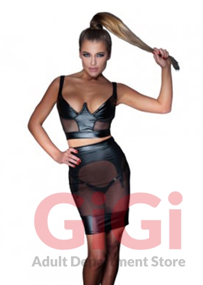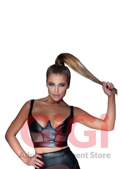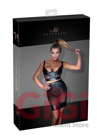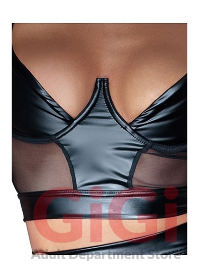 Top with underwired cups, transparent net inserts at the front (85% polyamide, 15% elastane). The cups cover half of the breasts. There is a full-length zip at the back, which makes it easy to put on the top and take it off again as well. Black.