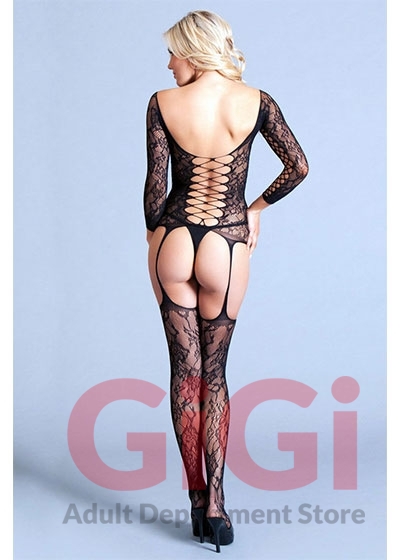 Long Sleeved Suspender Body Stocking with Scooped Back and Lace Up Details On Back and Inner Sleeves