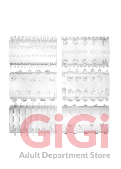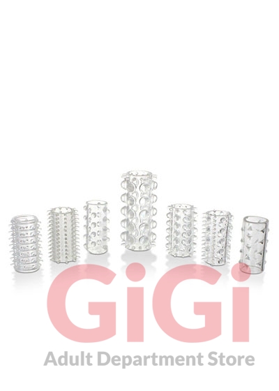 The advantage is clear! These 7 super-stretchy tickler penis sleeves add variety and stimulating pleasure with every thrust! Ranging from 1 3/4" to 2 3/4" long, these clear silicone sleeves are covered with pleasure nubs, ribs and sensi-studs that rub against her vagina and clitoris for more stimulation than ever before! Just roll them onto your shaft like a condom; the high-grade silicone can stretch to fit any size without tearing or breaking. Plus, the snug fit works much like a penis ring, delaying your orgasm will reducing blood flow to keep you harder for even longer.
