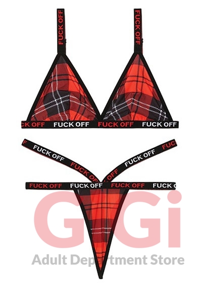 Plaid Bralette with "Fuck Off" Adjustable Elastic Straps and Matching Caged Panty