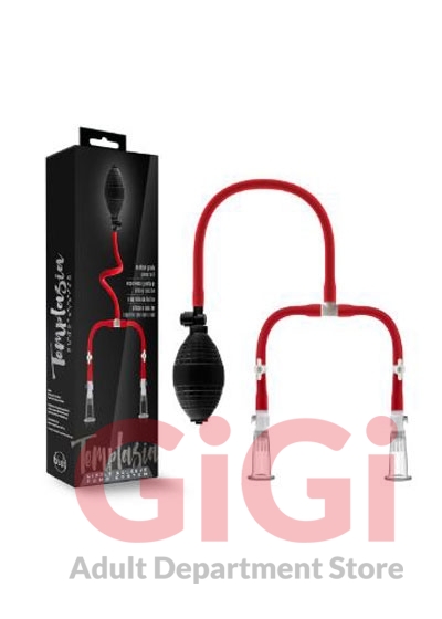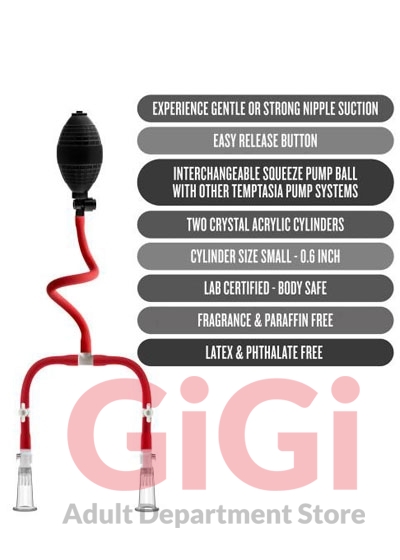 The Temptasia Beginners Nipple Pumping System is an exciting way to expand your erotic play. Tease and arouse as you use this easy squeeze ball pump to stimulate and enlarge your nipples. The crystal-clear acrylic cylinders allow for easy viewing, making this system great for either solo play or with a partner. The acrylic cylinders of the Beginners Nipple Pumping System are designed for those who are new to nipple enhancement. With non-porous silicone tubing and acrylic cylinders, this system is body safe and easy to keep clean.